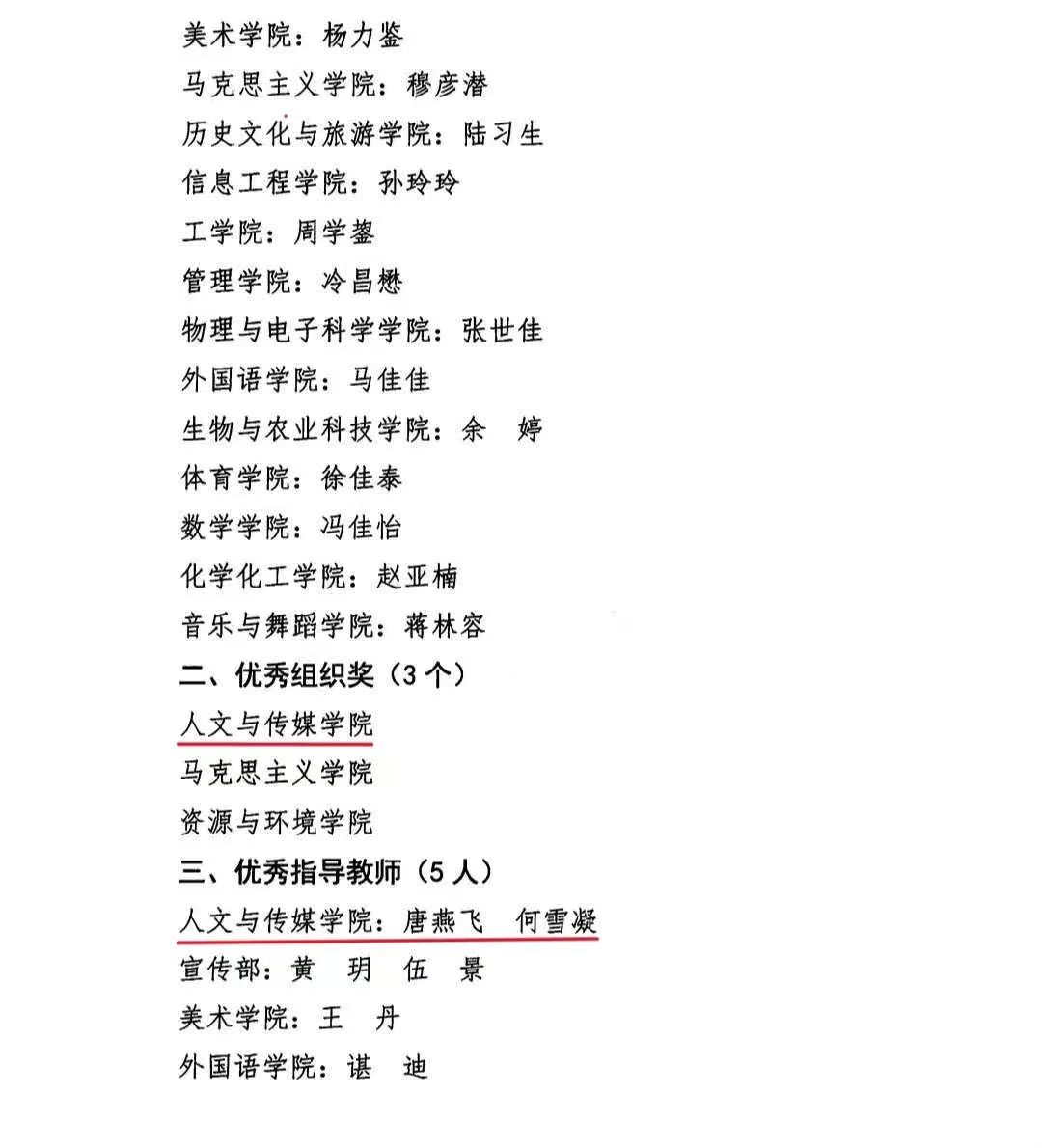 荣誉的背后,是师生的双向发力。何雪凝、唐燕飞两位老师的悉心指导,为学子们提供了专业支持。两位老师在活动组织与作品指导中有着出色的表现,被授予“优秀指导教师”称号。同时,学院凭借完善的组织流程、广泛的动员参与及丰硕的活动成果,成功获评“优秀组织奖”。