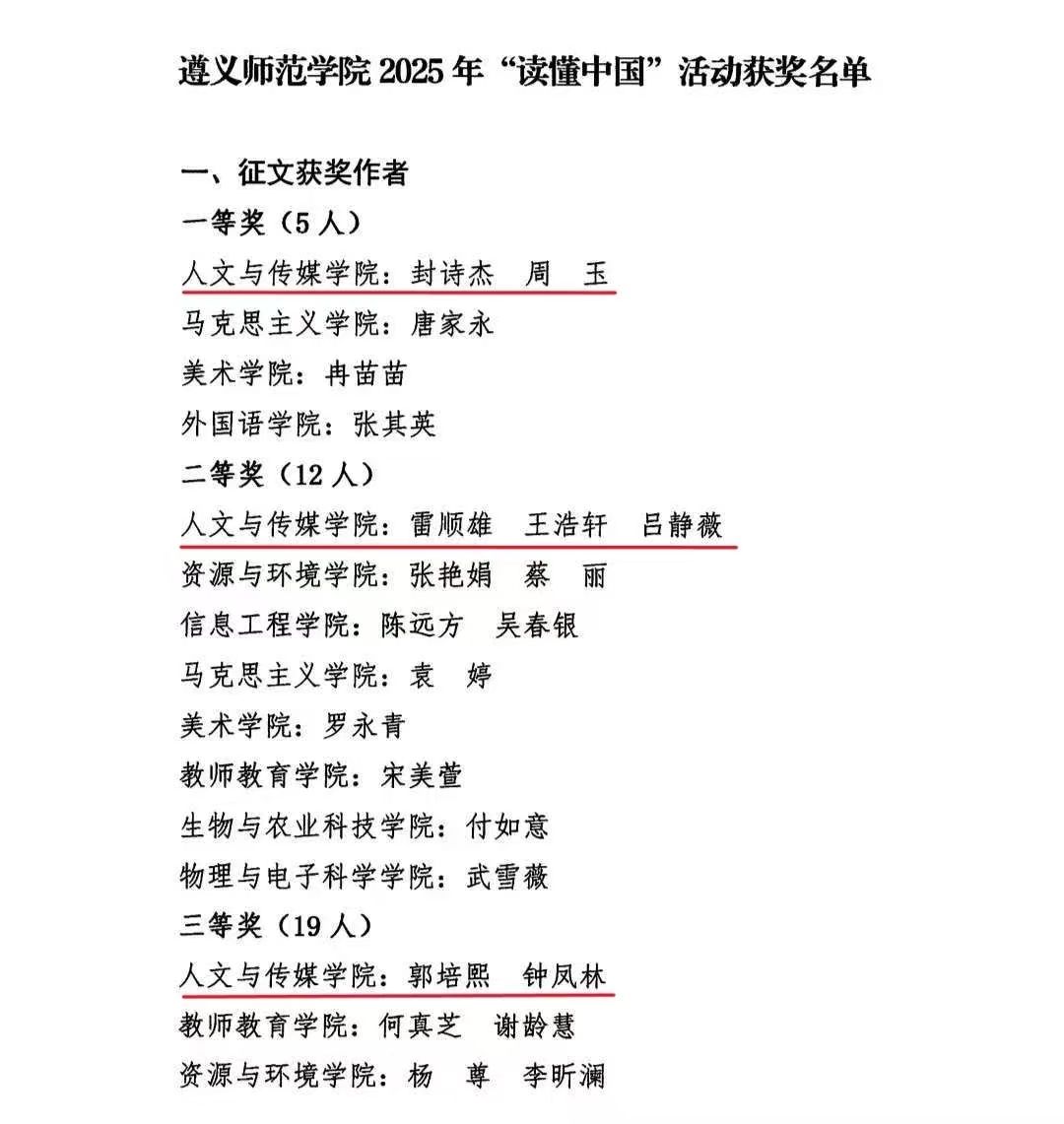 近日,学校党委办公室印发《关于公布2025年“读懂中国”活动校内获奖名单的通知》,人文与传媒学院在本次以“弘扬时代精神,建设教育强国”为主题的征文活动中表现突出,喜获多项荣誉,尽显学院学子风采。