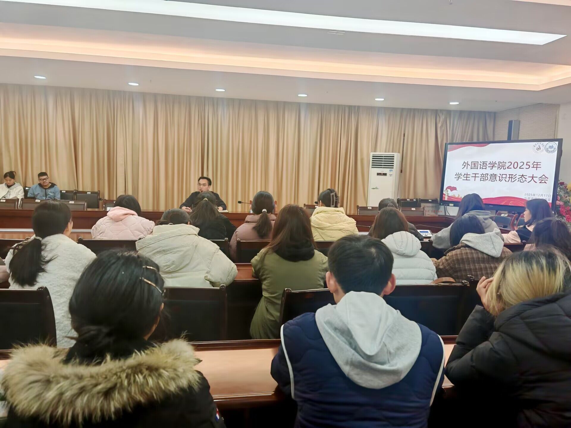 12月17日,外国语学院团总支、学生会在执文楼415会议室组织召开了学生干部作风建设暨意识形态专题培训大会。会议由学院党委副书记李太航主持,全体学生干部参会。
