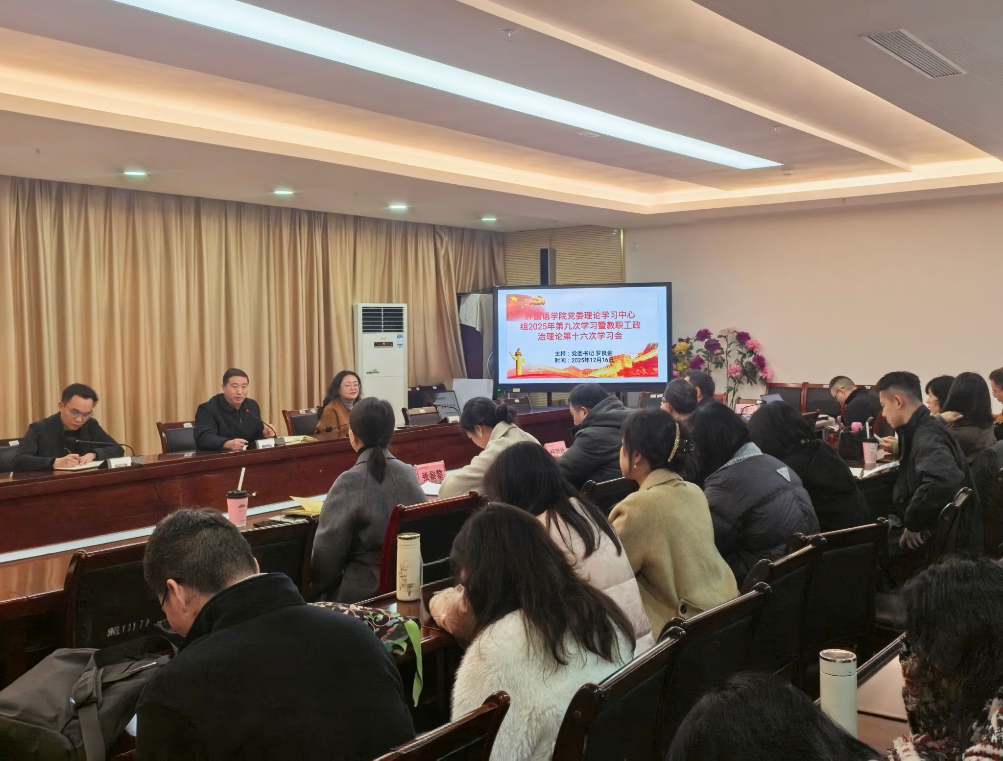 2025年12月16日,学院在执文楼415召开本年度党委理论学习中心组第九次学习暨教职工政治理论第十六次学习会。学院党委书记罗良金主持,党员教职工参加,非党员教职工列席。
