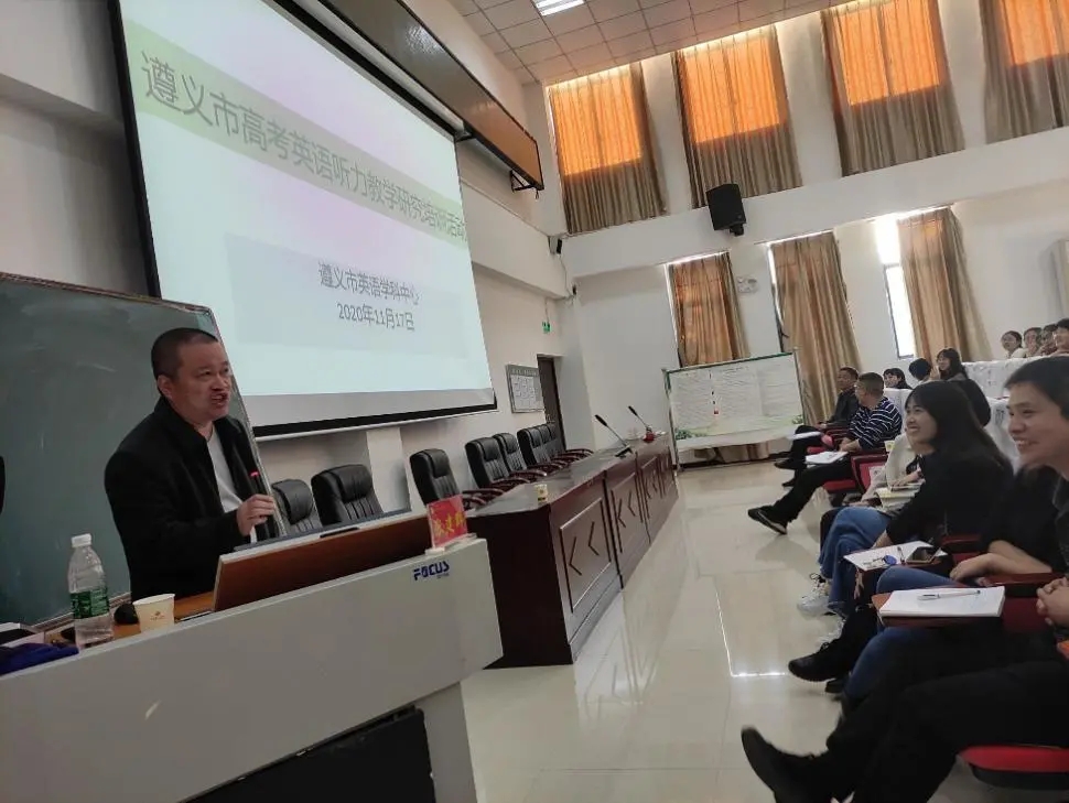2020年11月17日下午2:30,遵义市高考英语听力教学研究培训活动在遵义市第四中学举行。遵义市教科院副院长樊厚义,遵义市英语学科中心组长秦毅,贵阳市教科所教研员、特级教师代钊模,遵义师范学院外语学院院长张建群以及遵义市学科中心全体成员与全市教师代表参加了本次培训。培训由英语学科中心副组长张本昱主持。