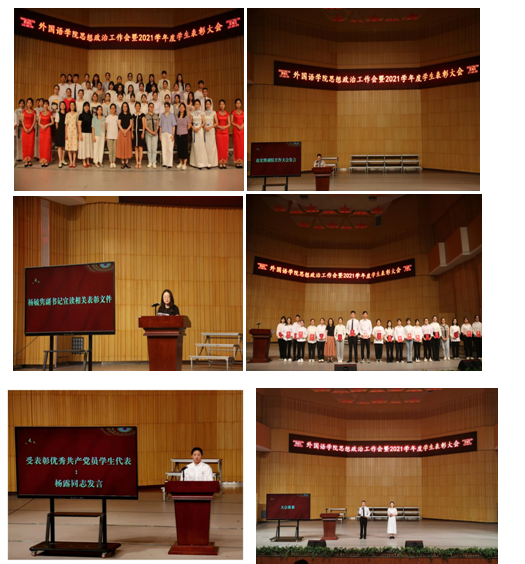 为了贯彻落实习近平新时代中国特色社会主义思想,落实立德树人的根本任务,传承红色基因,全面推进素质教育。外国语学院思想政治工作暨2021学年度优秀学生表彰大会于2022年6月24日17点40在执韵楼长征音乐厅顺利举行。出席本次大会的有外国语学院党委书记雷芸、党委副书记杨毓隽、教学副院长赵宏维、学生科教师、全体班主任、受表彰学生代表及全体在校学生。