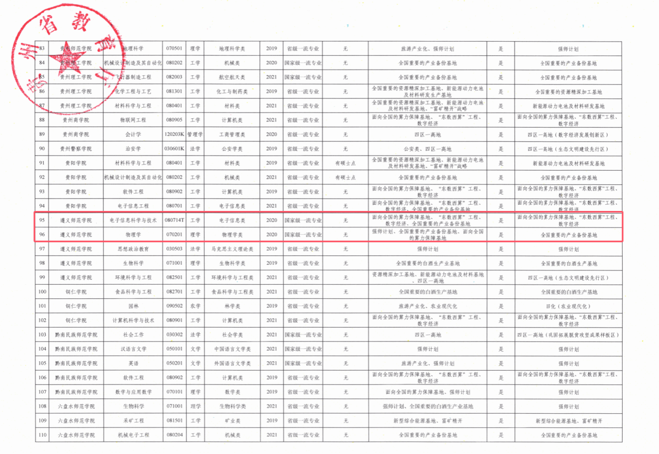 贵州省“金专”遴选认定工作是落实中共贵州省委办公厅、省人民政府办公厅《关于加快推动全省高等教育高质量发展的意见》(黔党办发〔2023〕10号)的重要举措,旨在紧扣“四新”“四化”战略和“四区一高地”建设需求,从全省418个国家级、省级一流专业建设点中遴选30%作为省级“金专”建设点,重点服务六大产业基地、新型城镇化、农业现代化、“强师计划”等重大战略领域,充分体现与贵州经济社会发展需求的高度契合。我院物理学、电子信息科学与技术专业自2021年获批国家级一流本科专业建设点以来,始终以“厚基础、强应用、重创新”为建设理念,为贵州基础教育优质均衡发展提供了坚实人才支撑,为贵州数字经济发展输送了大量应用型人才。