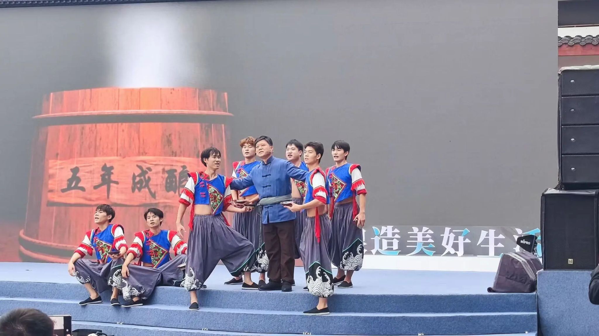 演出中,同学们充分运用所学专业知识,在多彩贵州公司专业编导的联合指导下,对贵州少数民族舞蹈元素进行了创造性编排。他们通过精心设计的舞蹈语汇,生动演绎了酱酒酿造过程中的匠心坚守与劳动之美,将抽象的文化内涵转化为极具感染力的舞台形象,赢得了现场观众的广泛好评。