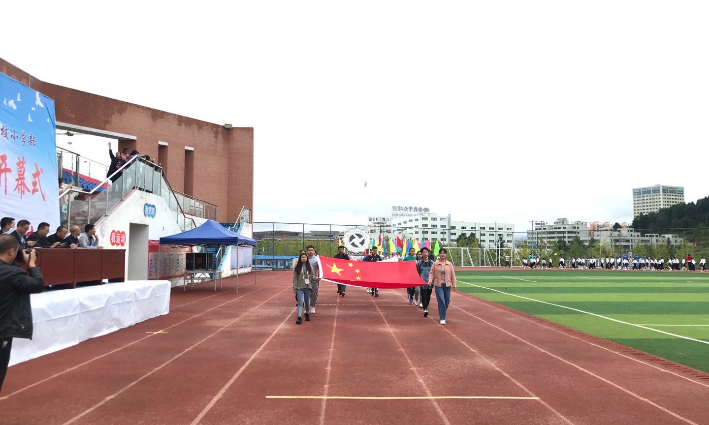 虽然天下着小雨,但依然抵挡不住孩子们对体育节的热烈期盼,下午13:00时,全体师生齐聚操场,活动在鲜艳的五星红旗的带领下拉开序幕。本次体育节还特别邀请了来自湄潭的六位跟岗校长担任本次入场式班级风采展示的评委。