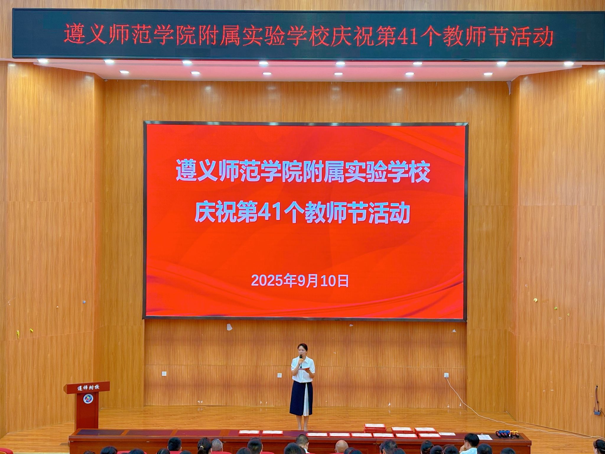 金风送爽丹桂香,躬耕教坛谱华章。2025年9月10日 14:30,遵义师范学院附属实验学校在初中教学部二号报告厅举行庆祝第41个教师节活动。全校教职工与学生代表齐聚一堂,贯彻“以教育家精神铸魂强师,谱写教育强国建设华章”的主题,共庆属于教育工作者的专属节日。
